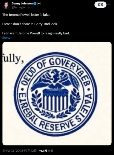 相比之下,约翰逊勇于承认,“杰罗姆·鲍威尔的信是假的。请不要分享。抱歉。确实很失态。”但他补充道他本人仍然非常希望鲍威尔辞职。